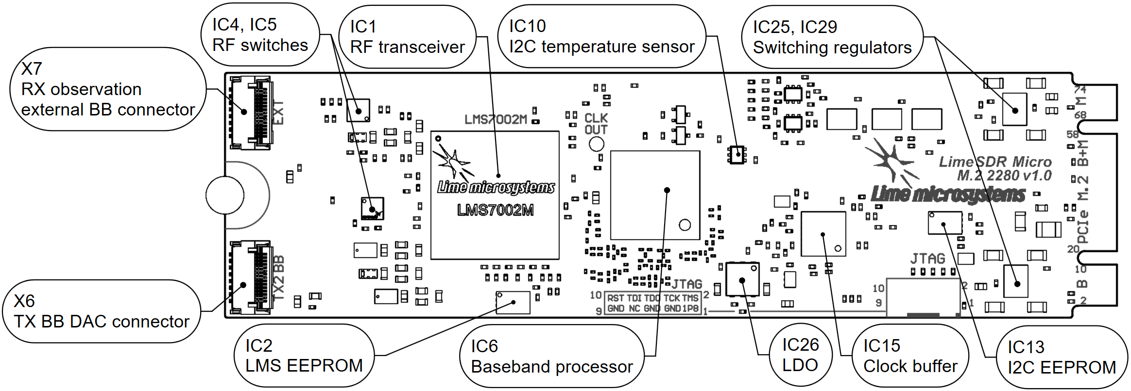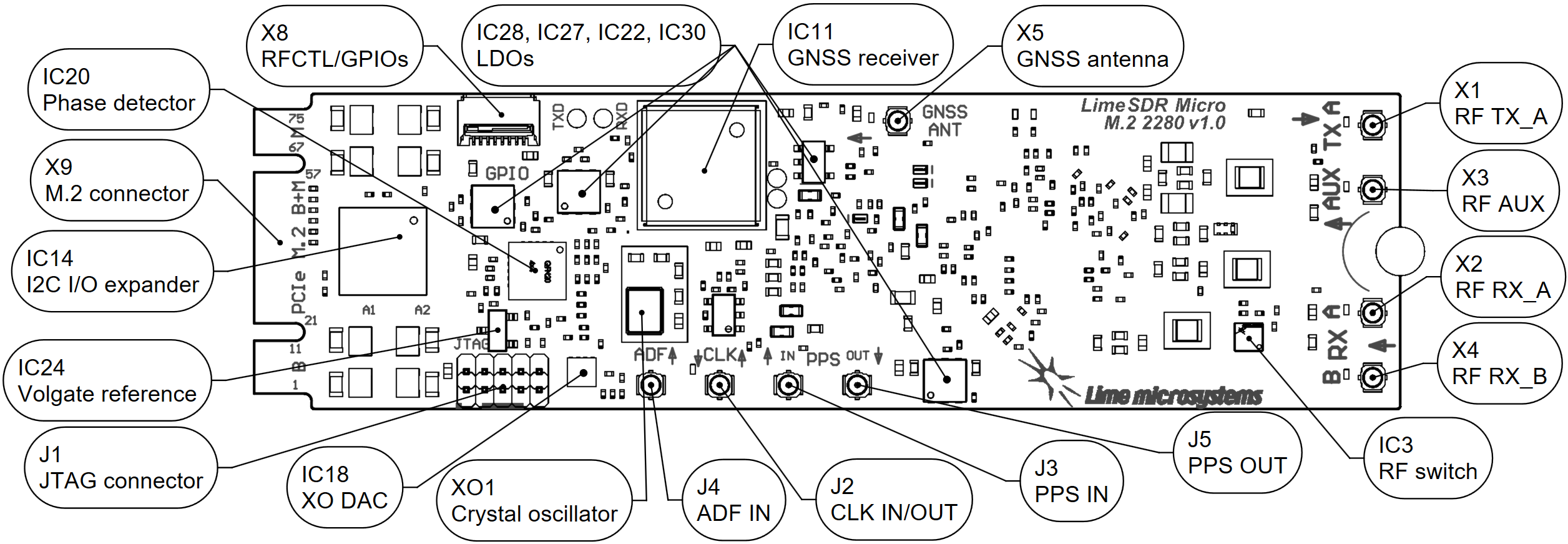 Figure 4: LimeSDR Micro M.2 2280 v1.0 board top connectors and main components