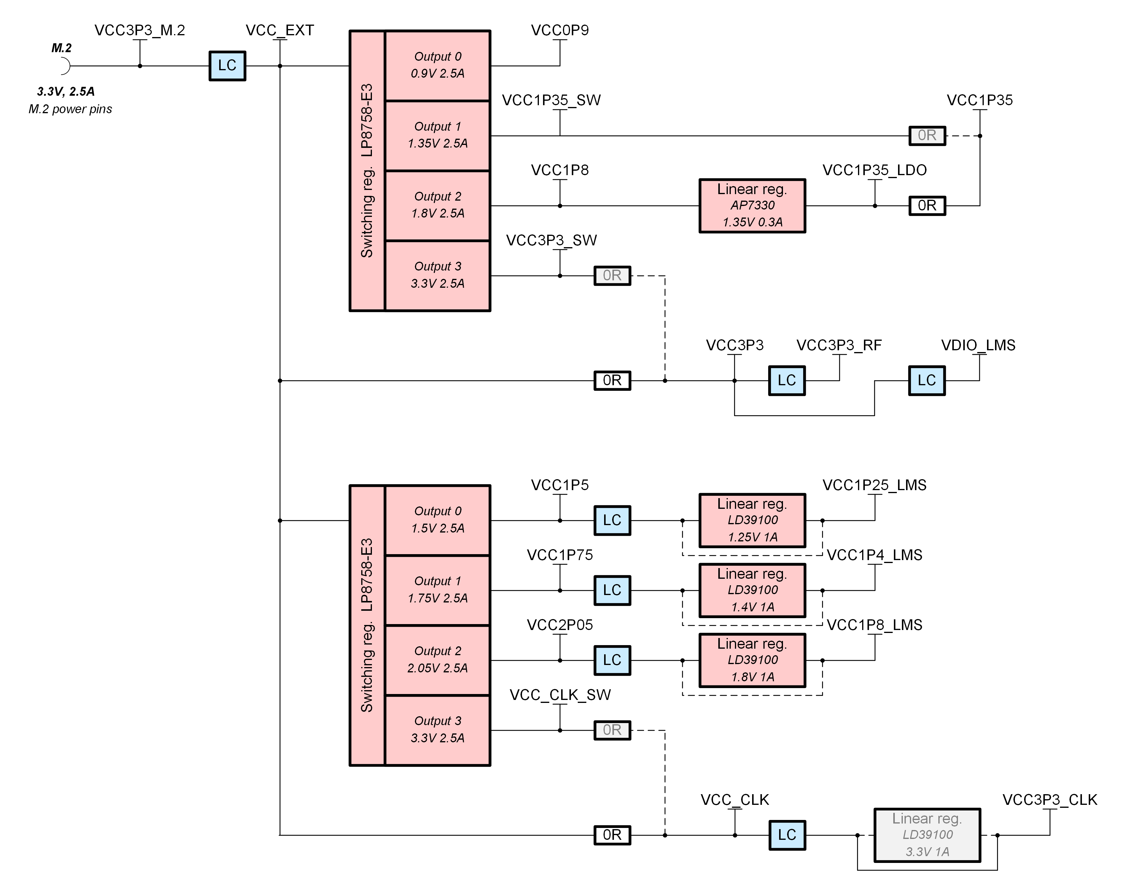 Figure 9: LimeSDR Micro M.2 v1.0 board power distribution block diagram